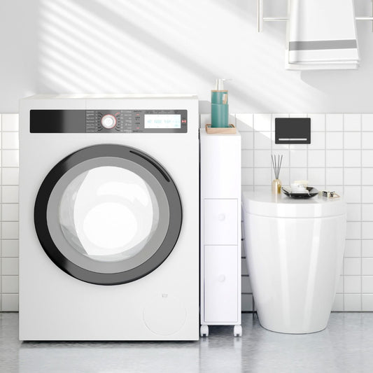 Placard De Salle De Bain Étroit Meuble De Rangement En Bois Avec Tiroirs Coulissants Profonds Paniers En Osier Et Porte-Brosse Blanc/Noir